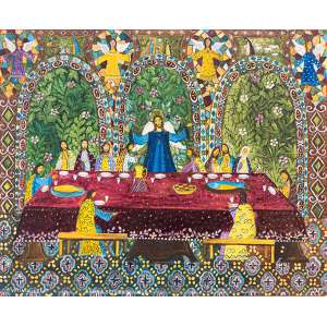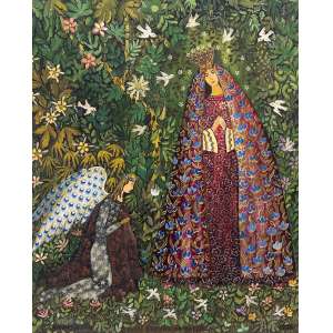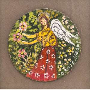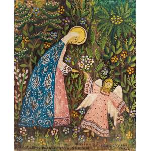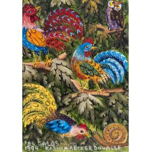óleo s/ tela, ass., dat. 1994, tit. na parte inf. e com carta colada no verso “Rio, 24/9/94 Querido filho Paulo, assim como o canto do Galo anunciou ao mundo o nascimento do CRISTO, que o canto desses galos anuncie para você uma era de PAZ, de AMOR e de PROSPERIDADE. São os votos da mãe que te ama, Rosina Becker do Valle”. 22 x 16 cm