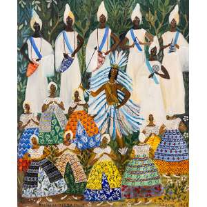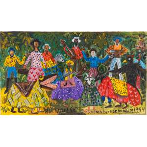 óleo s/ tela, ass. inf. esq., dat. 1968 e tit. “ Afoché” inf. dir., ass., dat. 1968, tit. “ Afoché” Folclore Brasileiro e sit. Brasil no verso. 55,5 x 46,5 cm
