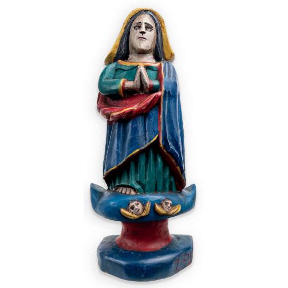 escultura em madeira policromada, ass. com as iniciais na base. 38 x 17 x 9 cm