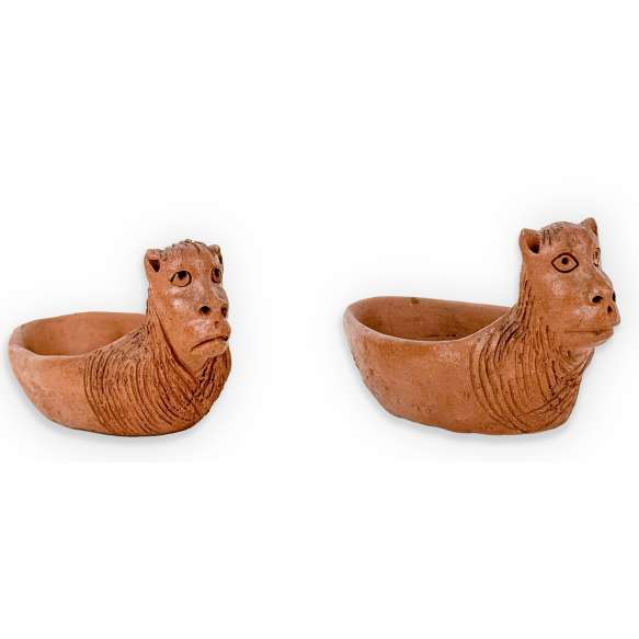 conjunto de duas esculturas em barro cozido, sendo uma delas ass. no verso da base uma com pequena lasca. 6,5 x 13 x 6 cm (cada)