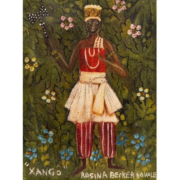 óleo s/ tela colada em chapa de madeira industrializada, ass. inf. dir., tit. inf. esq., ass., dat. 1975, tit. “Xangô, divindade dos raios, trovoadas e chuvas tempestades” e sit. Brasil no verso. 22 x 16 cm