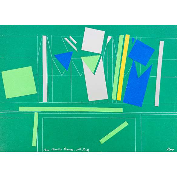 lápis de cor e colagem s/ papel, ass., dat. 2004 inf. dir. e com dedicatória “Para Marília Kranz” ass. centro inf. 23,5 x 33 cm