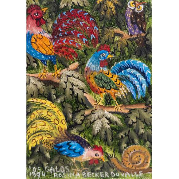 óleo s/ tela, ass., dat. 1994, tit. na parte inf. e com carta colada no verso “Rio, 24/9/94 Querido filho Paulo, assim como o canto do Galo anunciou ao mundo o nascimento do CRISTO, que o canto desses galos anuncie para você uma era de PAZ, de AMOR e de PROSPERIDADE. São os votos da mãe que te ama, Rosina Becker do Valle”. 22 x 16 cm