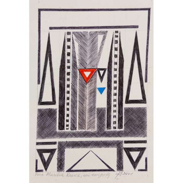 caneta esferográfica e colagem s/ papel, ass., dat. 2001 inf. dir. e com dedicatória “Para Marília Kranz, seu amigo” ass. inf. esq. MI 16,5 x 11 cm / ME 21,5 x 31,5 cm
