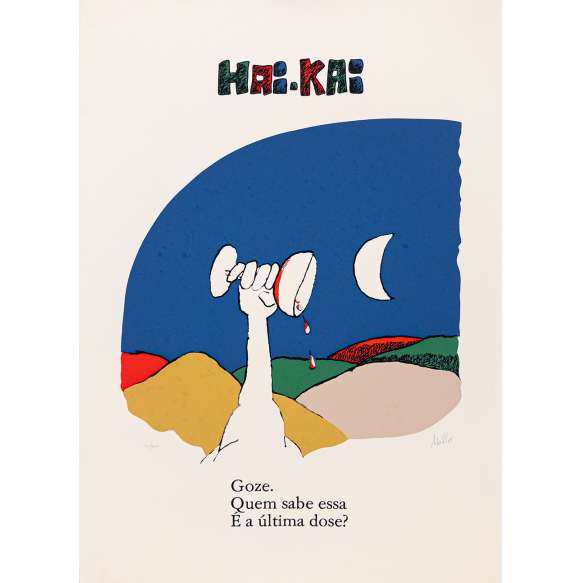 serigrafia em cores impressa s/ papel, ass. inf. dir., tit. centro sup., n. 162/200 inf. esq. e com a inscrição “Goze. Quem sabe essa é a última dose?” centro inf. 70 x 50 cm