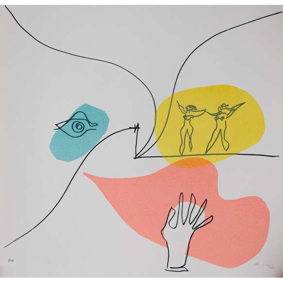 serigrafia em cores impressa s/ papel, ass., dat. 1990 inf. dir. e n. 18/100 inf. esq. edição Galeria Anna Maria Niemeyer obra criada para integrar o álbum da exposição comemorativa dos 80 anos do arquiteto e com objetivo de unir, numa única peça, os três principais focos de sua obra: as mulheres, a beleza e sua luta sociopolítica. 50 x 50 cm