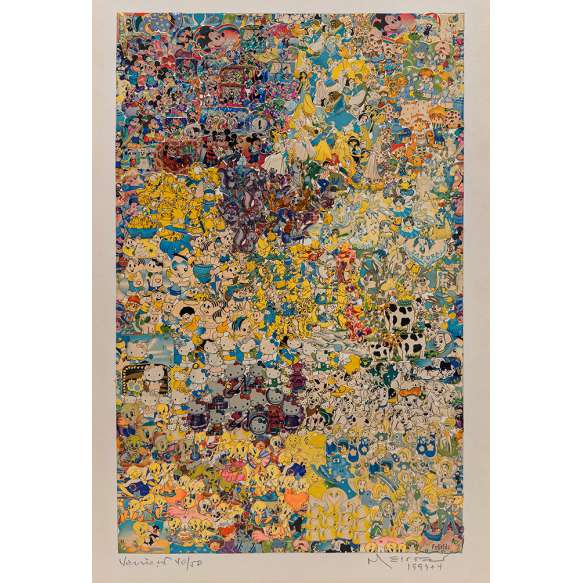 colagem de adesivos s/ gravura em papel, ass., dat. 1999 + 4 (2003) inf. dir., tit. e n. 40/50 inf. esq. MI 63 x 40 cm / ME 72,5 x 50 cm