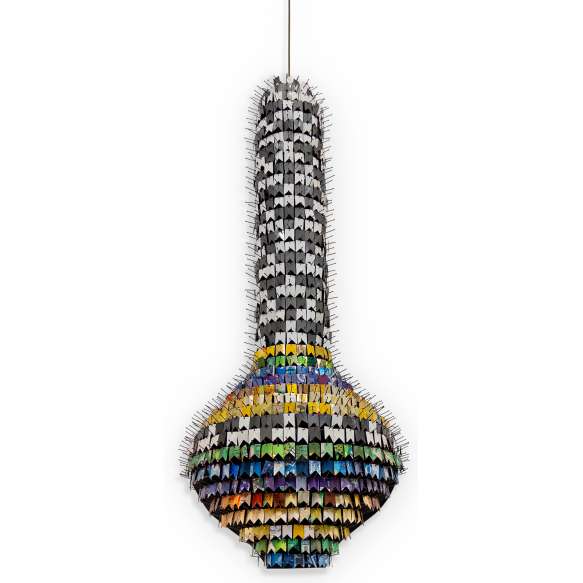 escultura em madeira industrial laqueada de preto, alumínio reciclado e alfinetes, ass. e dat. 2009 no verso. 84 x 32 x 20 cm