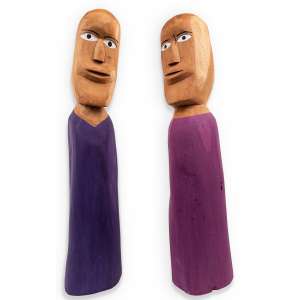 esculturas em madeira entalhada e pintada, ass. e sit. AL no verso da base. 41 x 9 x 9 cm (cada)