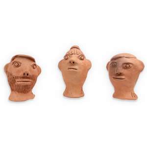 conjunto de três esculturas em barro, ass. nos versos dos pescoços. da esquerda para a direita: 12 x 9 x 8 cm. 15 x 9,5 x 9 cm. 12 x 10 x 8 cm