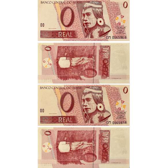 impressão off-set s/ papel moeda, sendo um exemplar n. CM006597R e outro n. CM 006596R inf. dir. - (ambos com indicação de autoria Cildo Meireles, dat. 2017 e sit. RJ no verso) - 6,5 x 14,4 cm