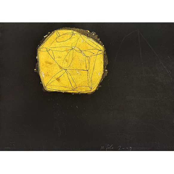 guache s/ gravura impressa s/ papel timbrado da Fundação Iberê Camargo com aplicação de folha de ouro, ass., dat. 2009 centro inf., com a inscrição “uma gravura feita durante residência na Fundação Iberê Camargo” e dedicatória “Para a grande Lígia com um beijo do amigo M. Solá”, ass., dat. outubro de 2010 e sit. Goiânia no verso - 44 x 59 cm