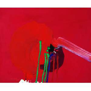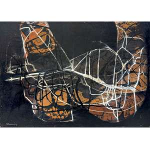 óleo s/ chapa de madeira industrializada, ass., dat. 1970 inf. esq. e com etiqueta da Galeria Cosme Velho no verso - catalogado e com certificado de autenticidade do Instituto Manabu Mabe - 38 x 46 cm