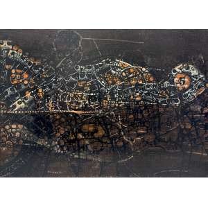 guache s/ gravura impressa s/ papel timbrado da Fundação Iberê Camargo com aplicação de folha de ouro, ass., dat. 2009 centro inf., com a inscrição “uma gravura feita durante residência na Fundação Iberê Camargo” e dedicatória “Para a grande Lígia com um beijo do amigo M. Solá”, ass., dat. outubro de 2010 e sit. Goiânia no verso - 44 x 59 cm