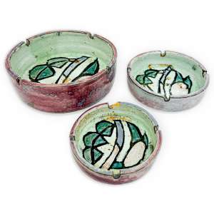 cerâmica esmaltada, ass. com as iniciais, dat. 1973 na lateral, ass. com as iniciais, dat. 1973, com símbolo da Oficina Brennand e selo da Ciclo nos versos - menor: 3 x ø13 cm - médio: 4 x ø15 cm - grande: 6,6 x ø20 cm