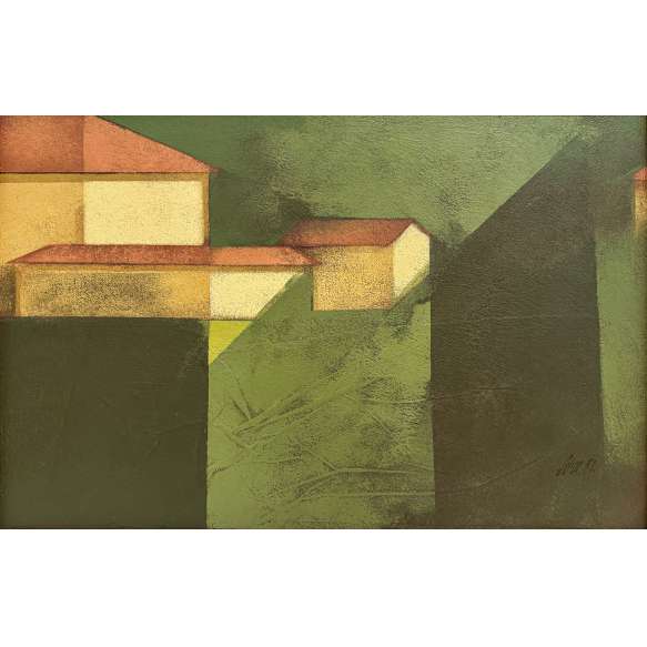 vinil e colagem encerados s/ tela, ass., dat. 1982 inf. dir., ass., dat. 02/04/1982, tit., sit. Ouro Preto e com numeração do artista 47/OP/82 no verso