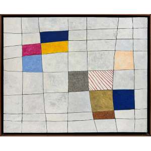 óleo e colagem de tecido s/ cartão colado em chapa de madeira industrializada, ass., dat. 1989-4 na parte inf., ass., dat. 1989 e com inscrições P.86 e FPT4788 no verso