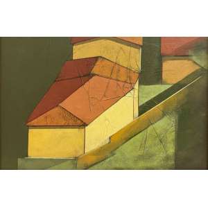 vinil e colagem encerados s/ tela, ass., dat. 1982 inf. dir., ass., dat. 02/04/1982, tit., sit. Ouro Preto e com numeração do artista 47/OP/82 no verso