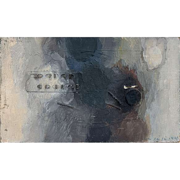 assemblage (óleo, moeda, alfinetes e inserção de metal) s/ madeira, ass. e dat. 1961 inf. dir. - catalogado sob o n. BR 1414 da Galeria Bonino